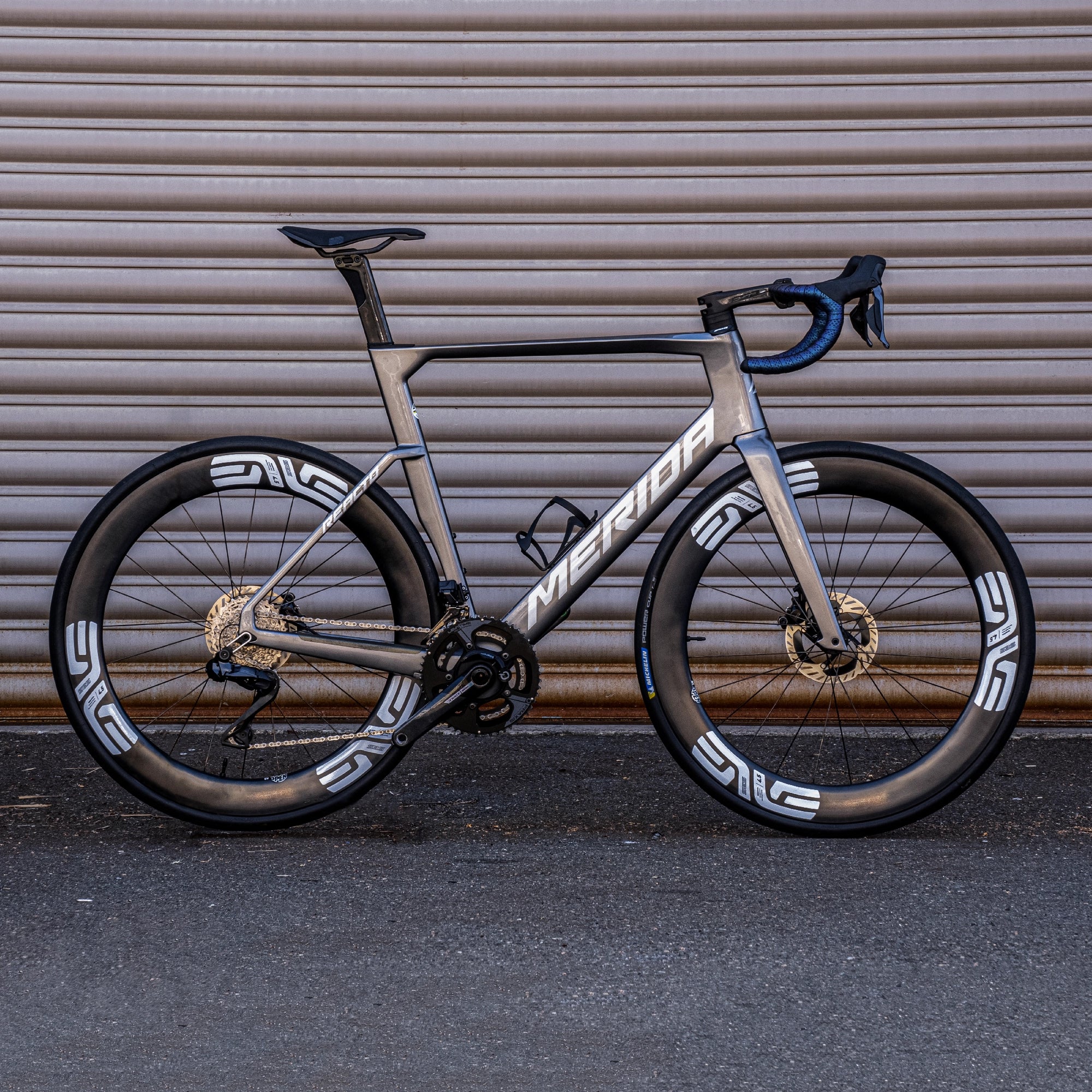 Freshly wrapped in reflective bar tape. - Enve foundation 65 carbon wheel set, setup tubeless to Michelin powercups 30mm.
