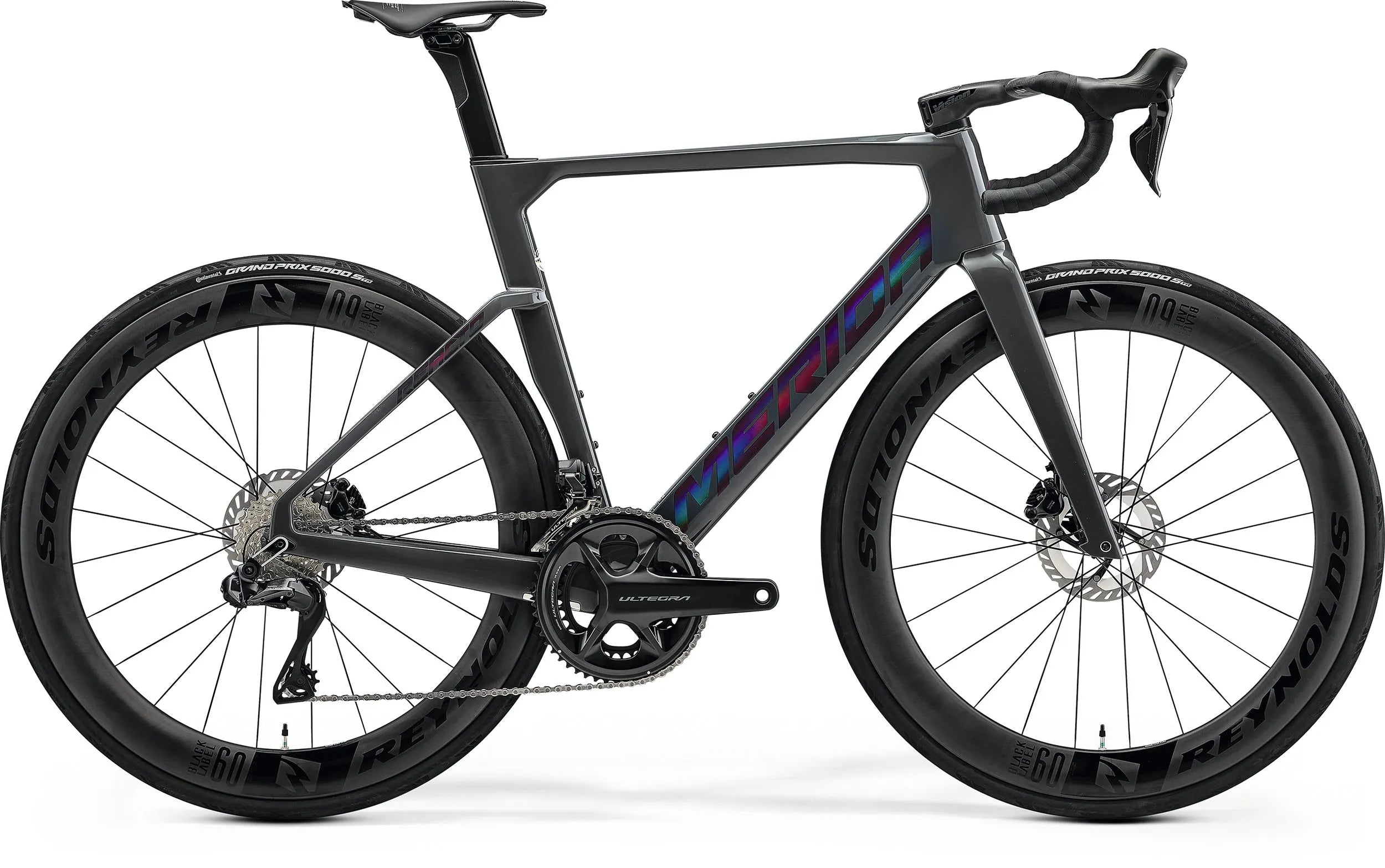 The Merida Reacto 9000 Road Race Bike in Cool Grey/Purple is a high-performance machine designed for speed and efficiency. Its lightweight carbon frame and fork provide a responsive ride, while the Shimano Ultegra Di2 groupset ensures precise and effortless shifting. Hydraulic disc brakes offer reliable stopping power in all conditions, and the tubeless-ready carbon wheels enhance ride quality and reduce the risk of flats. With its aerodynamic design, the Reacto 9000 is perfect for competitive cyclists looking to gain an edge on the road.